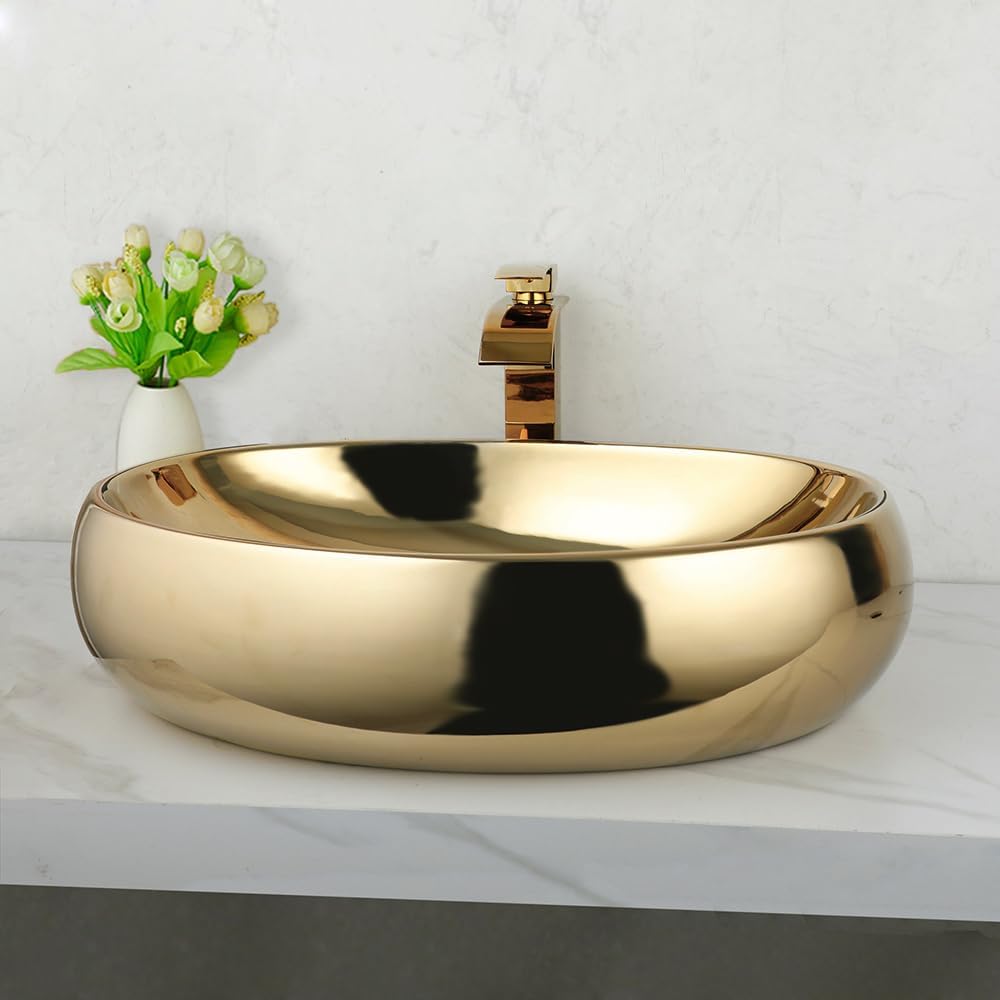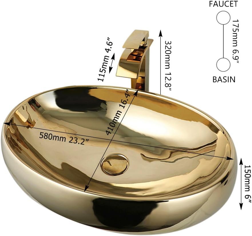 23 Inch Bathroom Vessel Sink with Waterfall Faucet and Pop-Up Drain Combo,Gold Ceramic Sink Bowl Modern Vessel Sink Above Counter Oval Bathroom Sink Basin