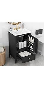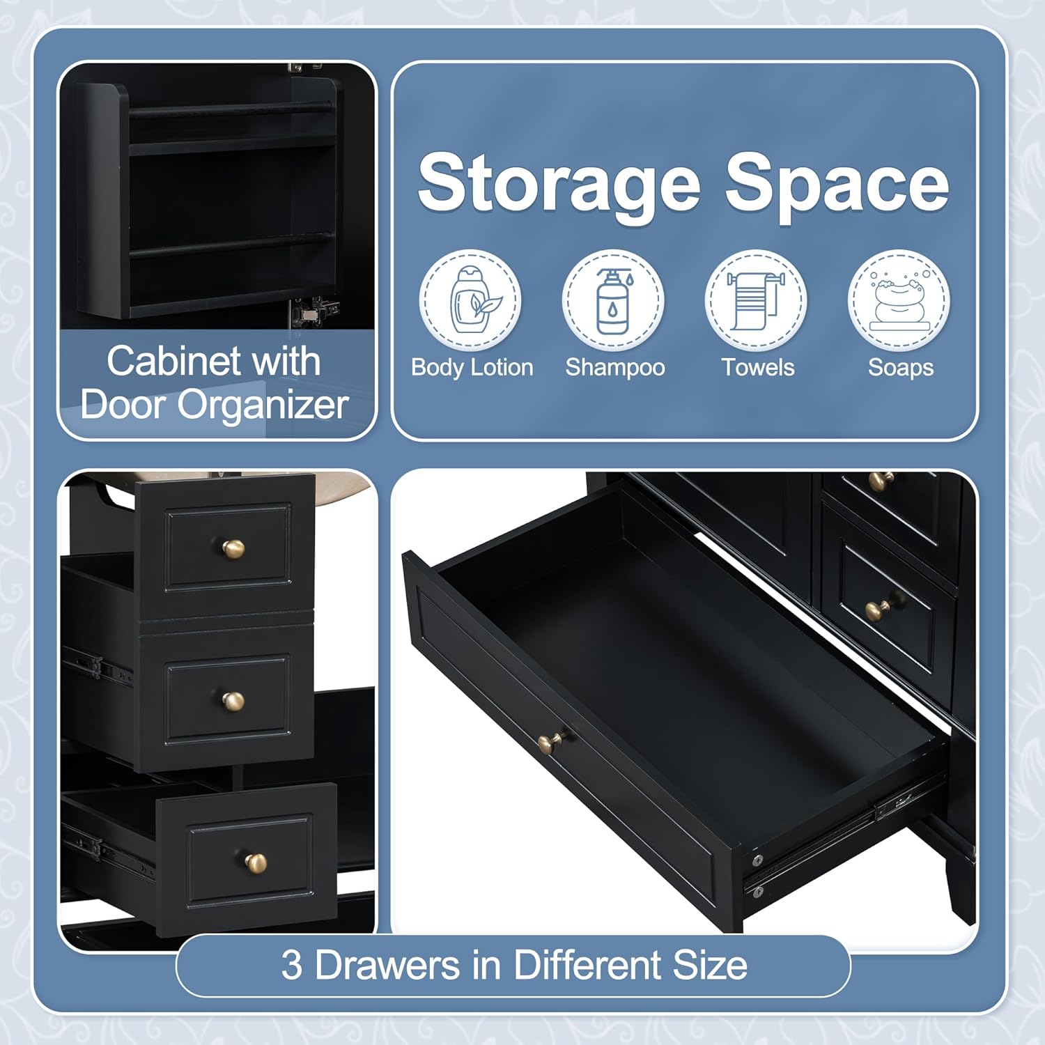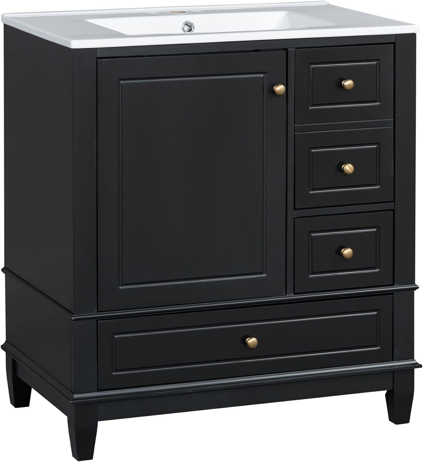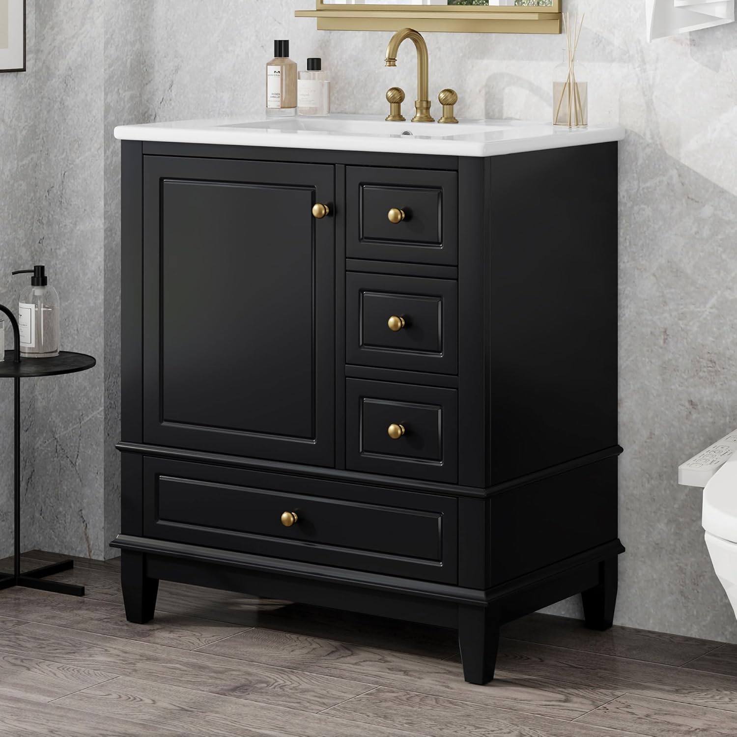 30" Bathroom Vanities with Ceramic Sink, Storage Cabinet with 3 Drawers and Door Shelf, Soft-Closing Door, Solid Wood Legs, Black